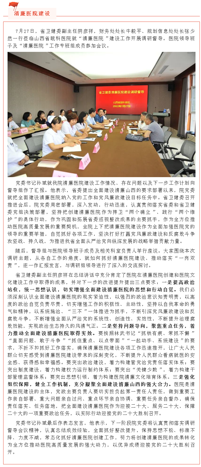 【清廉医院建设】山西省卫健委调研组莅临山西省眼科医院就全面建设清廉医院进行督导调研